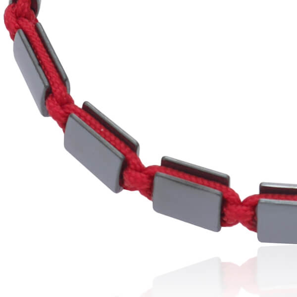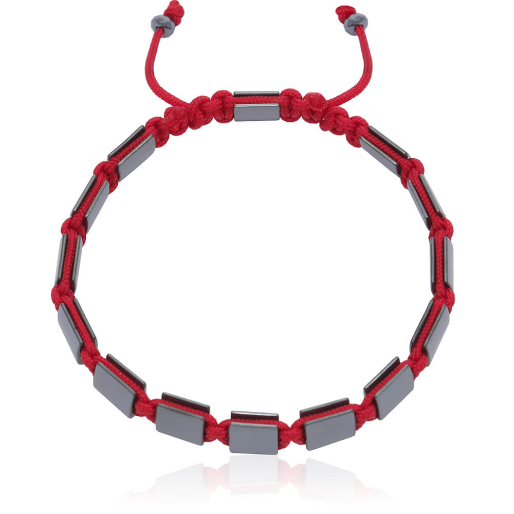 Bransoletka typu shamballa jest pleciona ręcznie. Model ten składa się z naturalnych kamieni grafitowego hematytu wielkości 8x8 mm i sznurka jubilerskiego w kolorze czerwonym. Bransoletka posiada wygodne rozsuwane zapięcie wykonane z kamienia hematytu i sznurka, oraz kamienie hematytu wielkości 4 mm na zakończeniach sznurków.