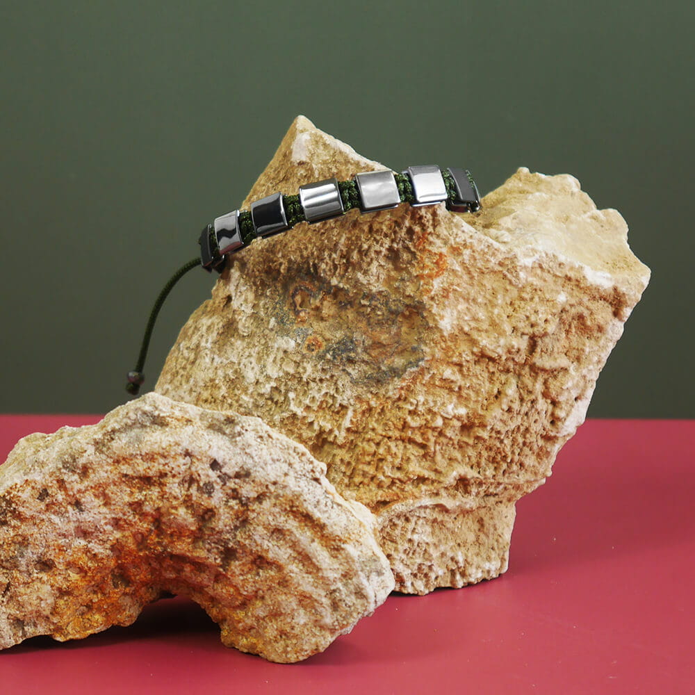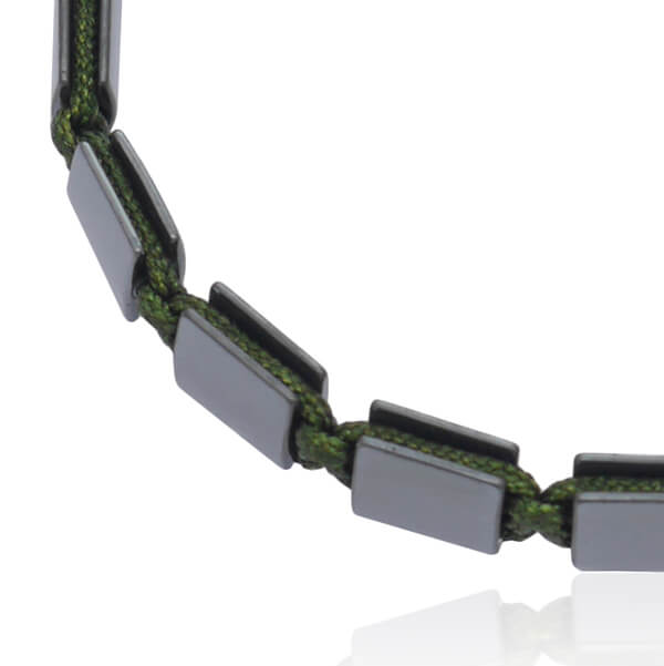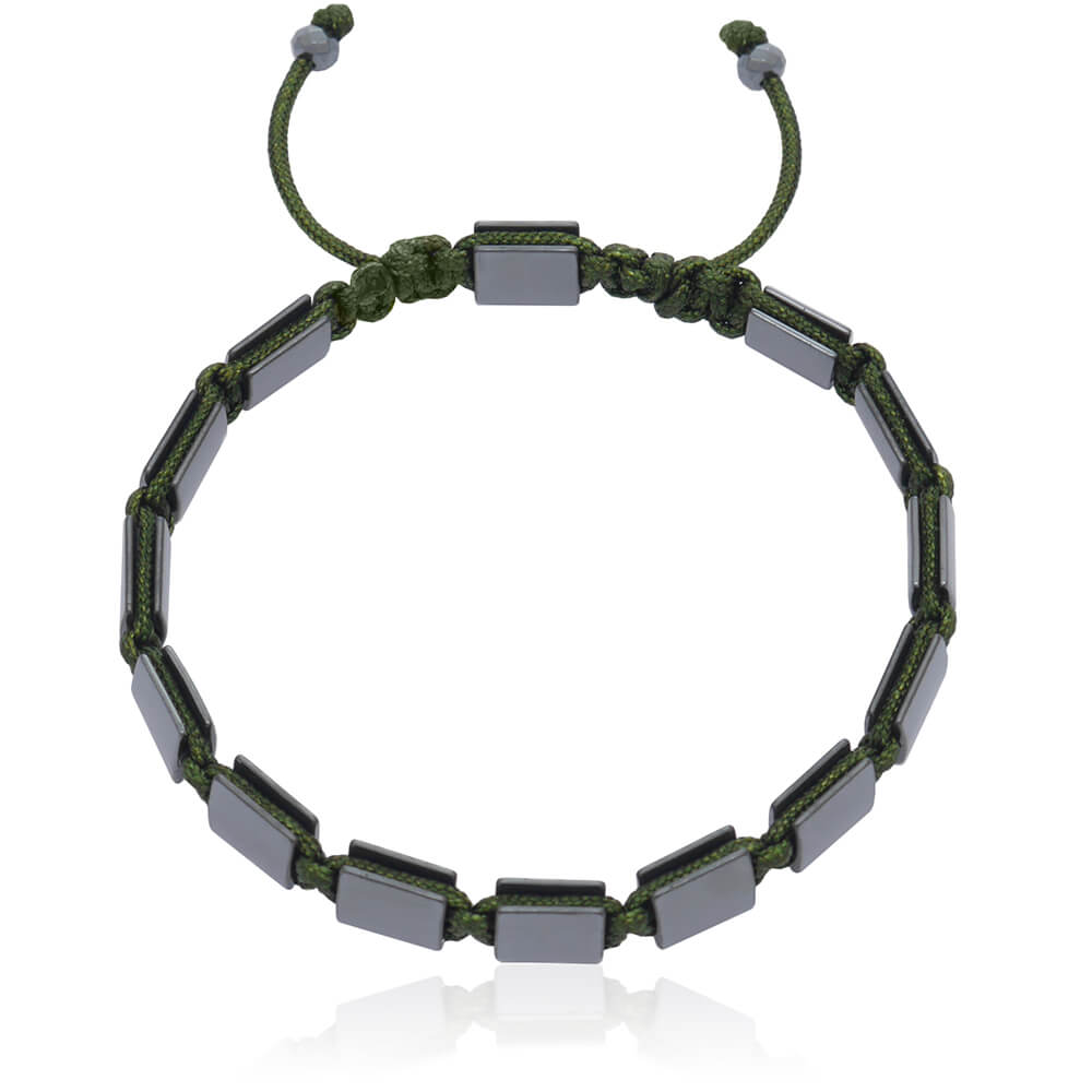 Bransoletka typu shamballa jest pleciona ręcznie. Model ten składa się z naturalnych kamieni grafitowego hematytu wielkości 8x8 mm i sznurka jubilerskiego w kolorze oliwkowo zielonym. Bransoletka posiada wygodne rozsuwane zapięcie wykonane z kamienia hematytu i sznurka, oraz kamienie hematytu wielkości 4 mm na zakończeniach sznurków.