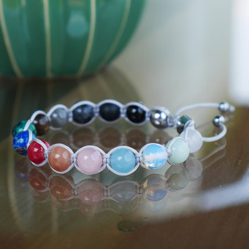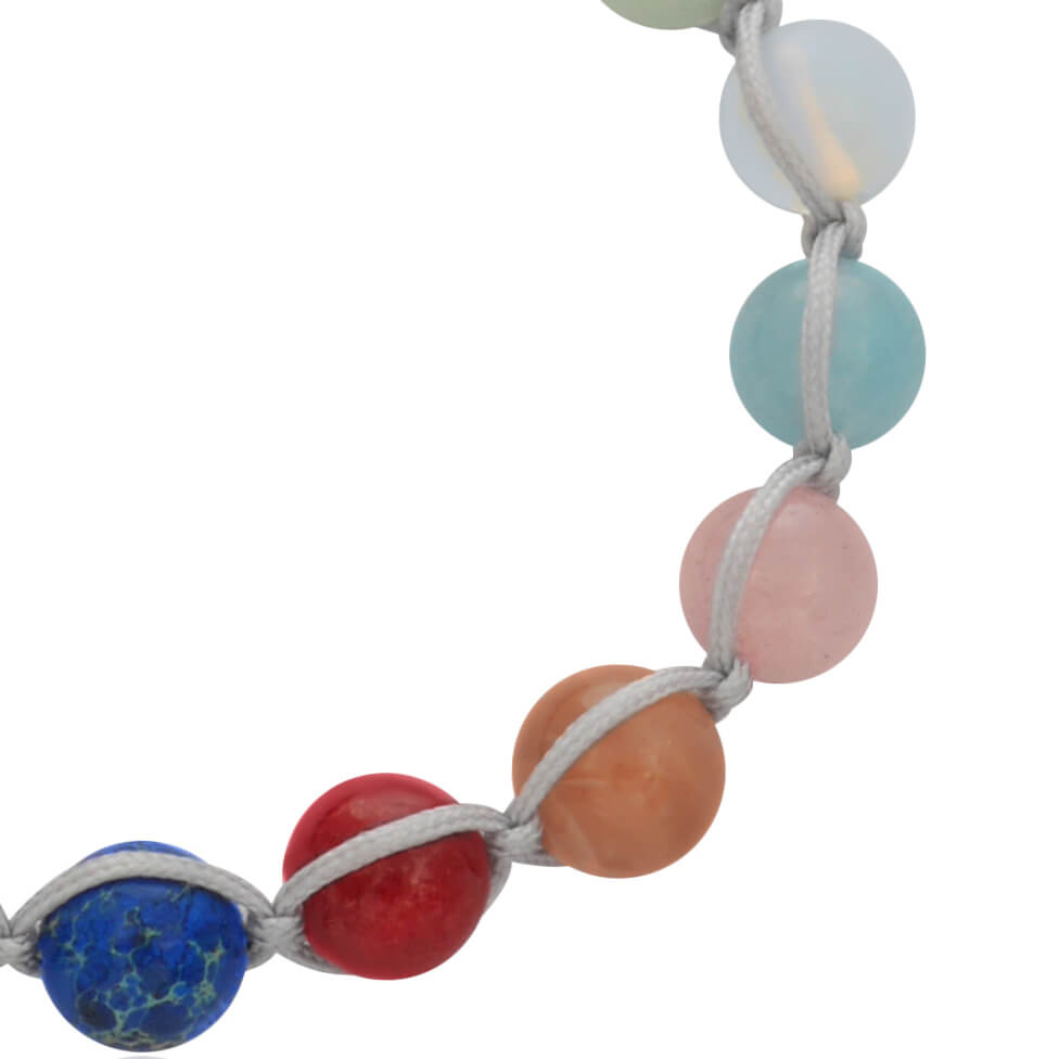 Bransoletka typu shamballa jest pleciona ręcznie i składa się z naturalnych kamieni wielkości 8 mm i sznurka jubilerskiego koloru szarego. Model ten posiada kamienie agatu mlecznego i czarnego, amazonitu, kamienia słonecznego, jaspisu niebieskiego, chryzkoli, bronzytu, labradorytu w ciemnym i jasnym odcieniu, onyksu, opalitu, hematytu w srebrnym kolorze, kwarcu niebieskiego i różowego oraz koralu. Bransoletka posiada rozsuwane zapięcie z kamieniem hematytu z grawerowanym logo i kamienie hematytu wielkości 4 mm na zakończeniach.