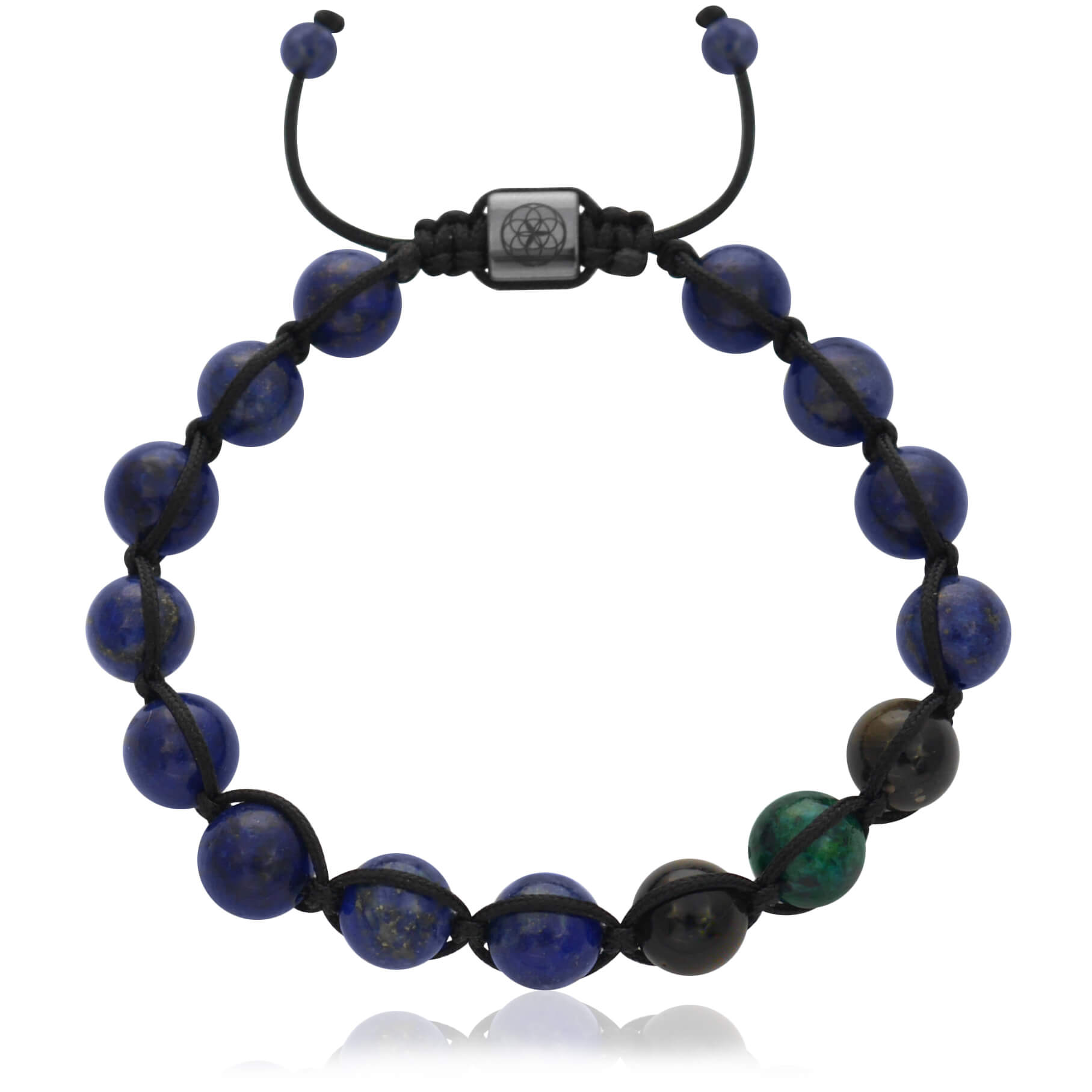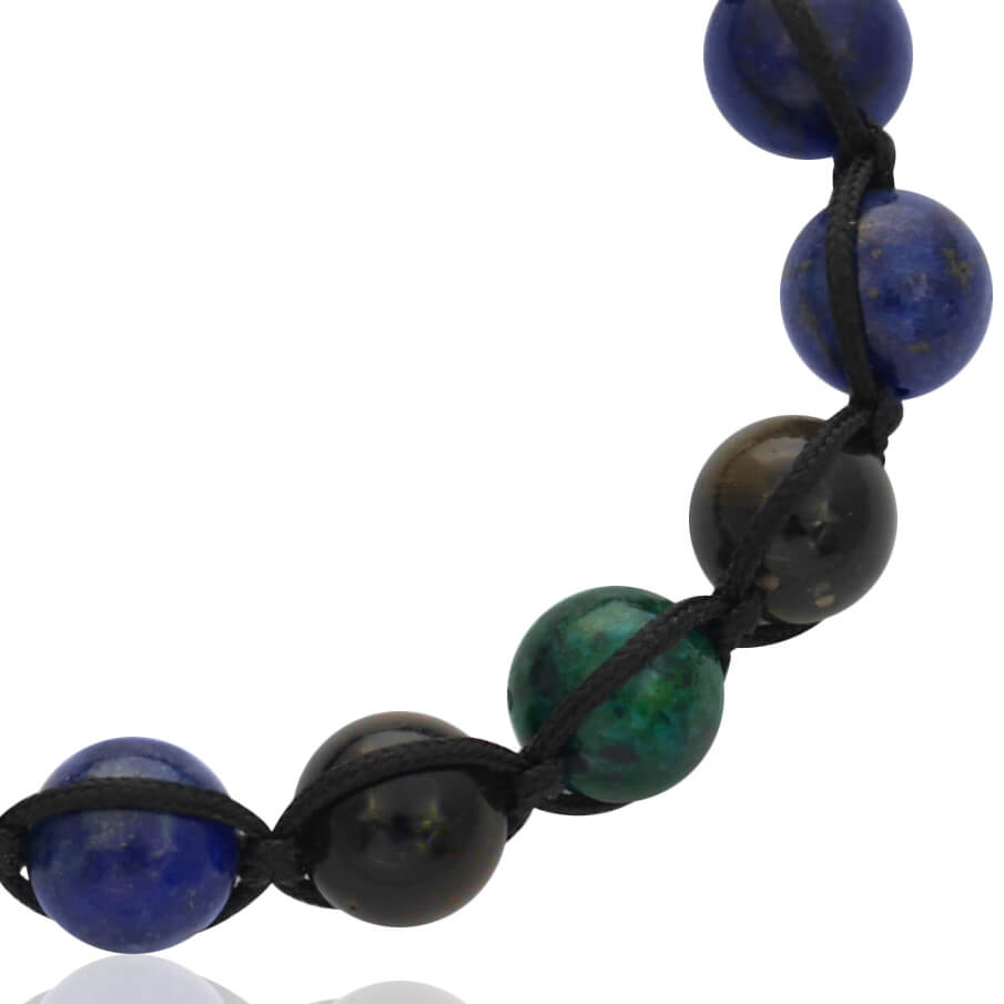 Bransoletka shamballa jest wykonana ręcznie i składa się z naturalnych kamieni lapisu lazuli, obsydianu i chryzokoli o wielkości 8 mm. Model ten jest ręcznie pleciony z wysokiej jakości wytrzymałego sznurka jubilerskiego czarnego koloru. Bransoletka posiada wygodne rozsuwane zapięcie z kamieniem grafitowego hematytu z logo oraz dwa kamienie lapisu lazuli wielkości 4 mm na zakończeniach sznurków.