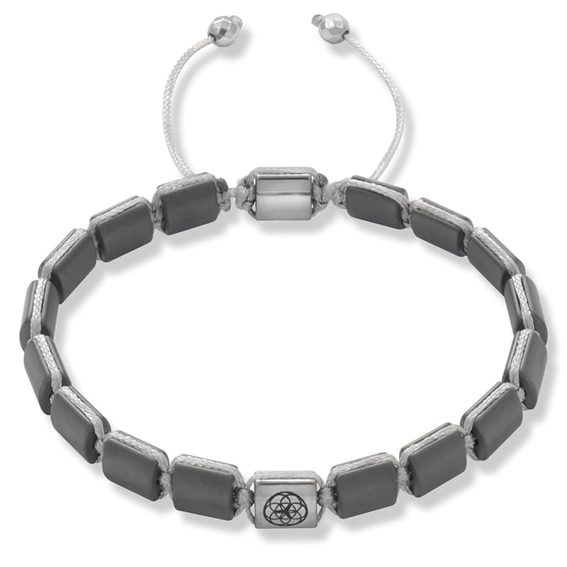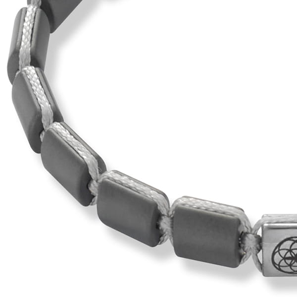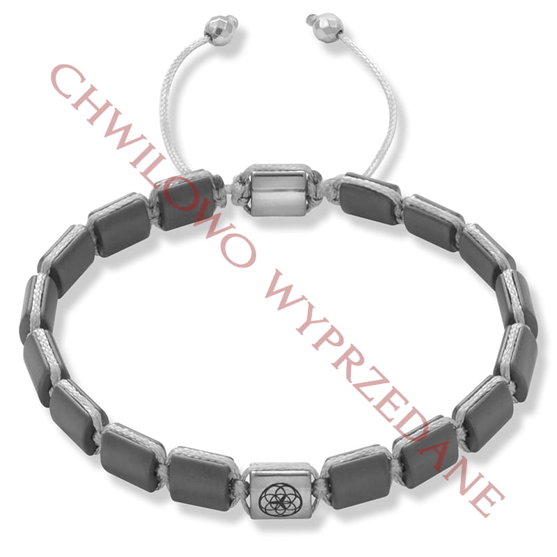 Bransoletka jest wykonana z naturalnych kamieni szarego matowego hematytu w kształcie kwadratu o wielkości 7 x 7 mm. Model ten w centralnym miejscu posiada kamień srebrnego hematytu z grawerowanym logiem. Bransoletka jest zapinana na rozsuwane zapięcie za sznurka i na zakończeniach posiada dwa kamienie fasetowanego srebrnego hematytu wielkości 4 mm.