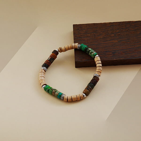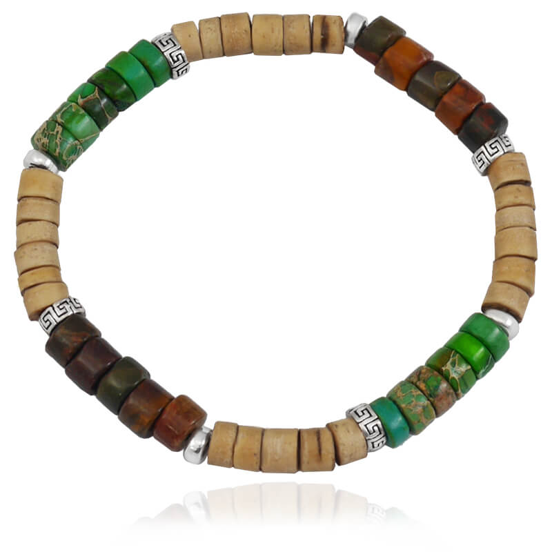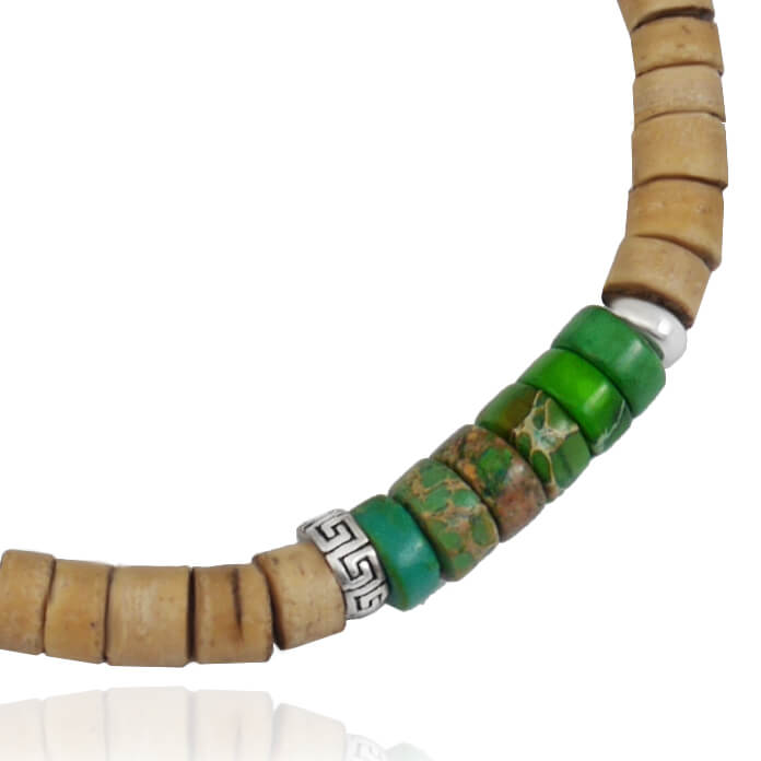 Bransoletka z kamieni krążki jaspis zielony brązowy kokos jasny srebro