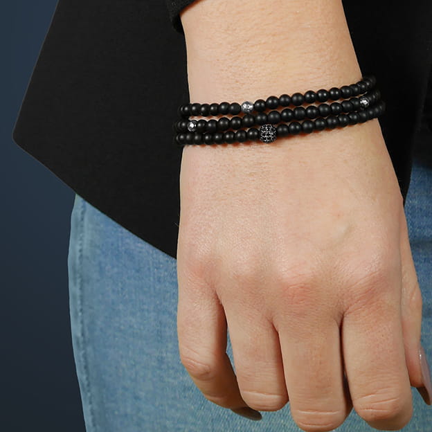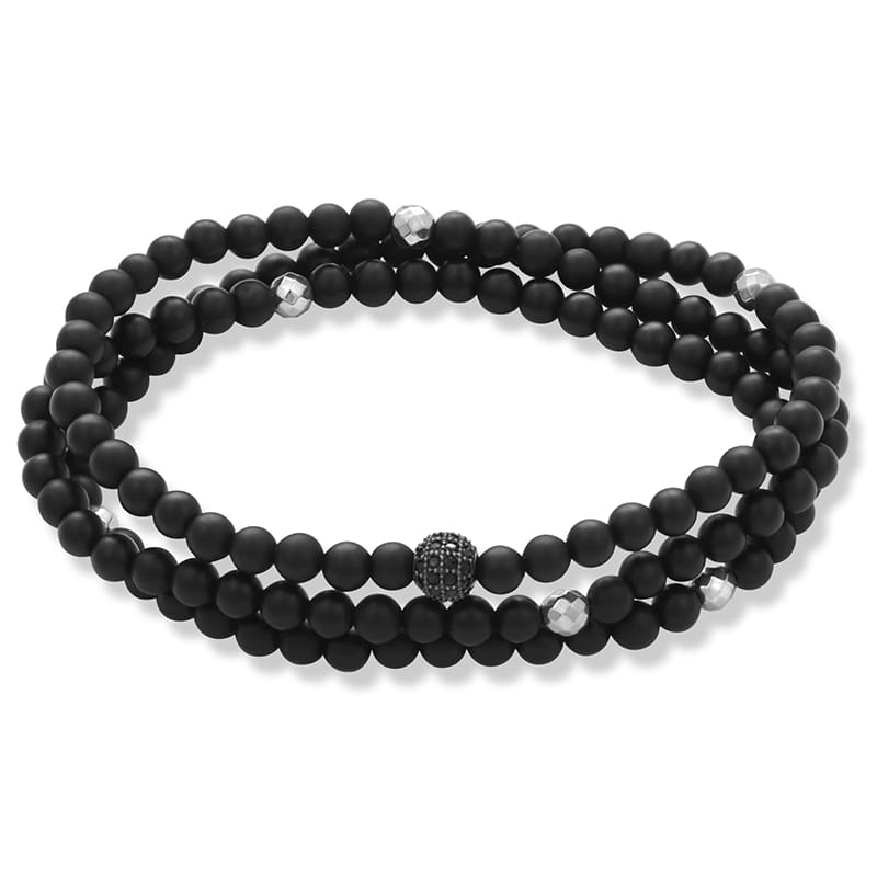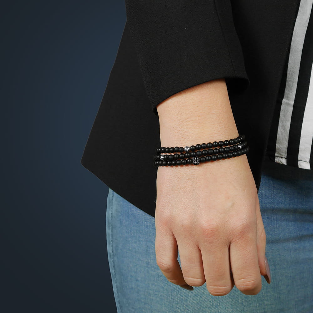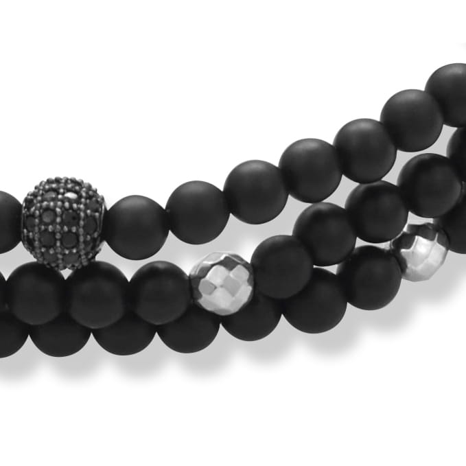 Bransoletka jest wykonana z naturalnych kamieni czarnego matowego onyksu i srebrnego fasetowanego hematytu wielkości 4 mm. Model ten posiada kulkę z kryształkami w czarnym kolorze wielkości 6 mm. Bransoletka jest wykonana na wytrzymałej gumce jubilerskiej i jest potrójnie oplatana wokół nadgarstka.