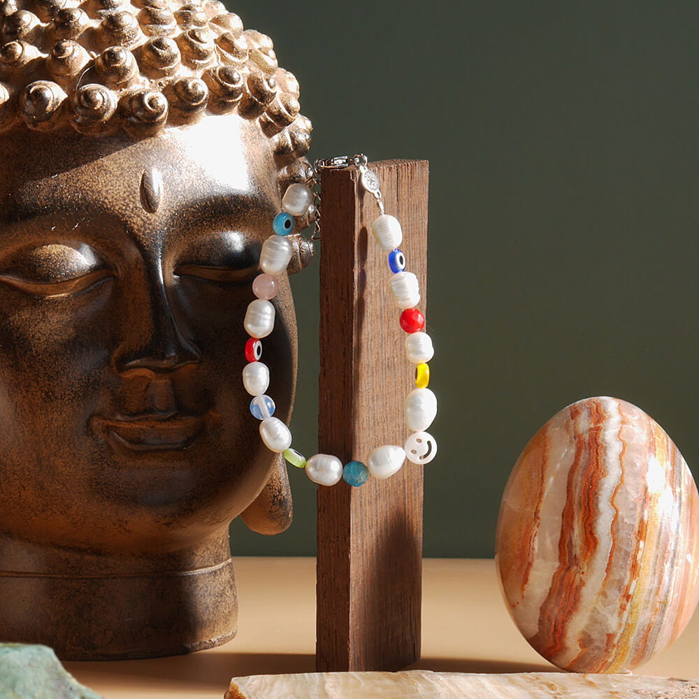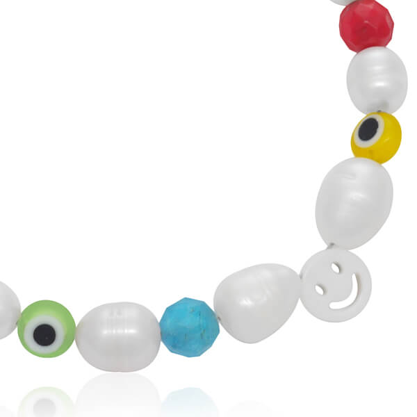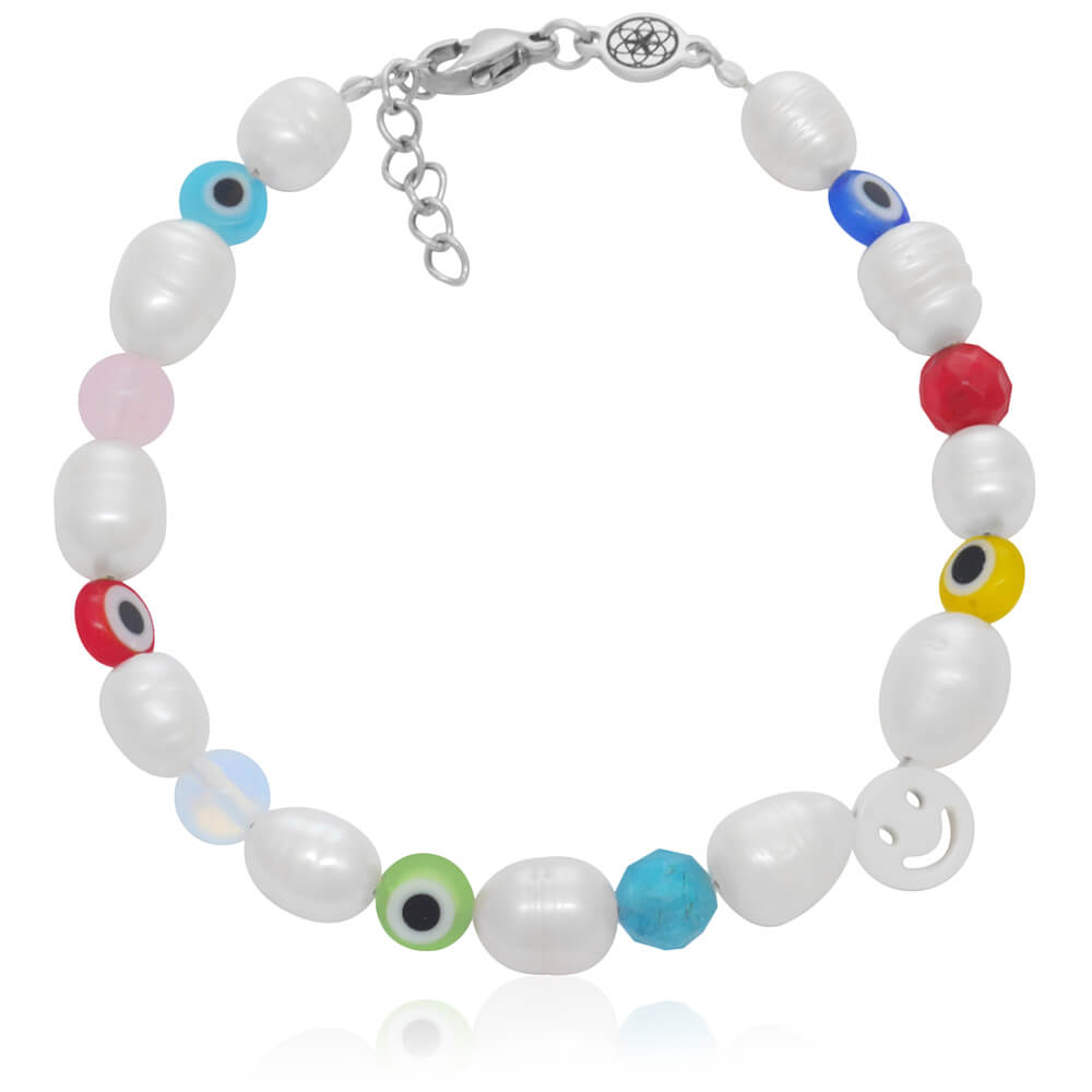 Bransoletka z pereł smile kamienie kwarc koral apatyt szkło oko proroka stal szlachetna