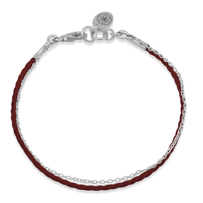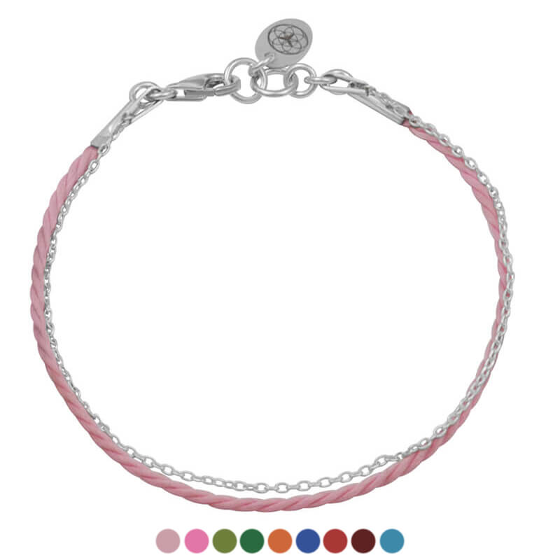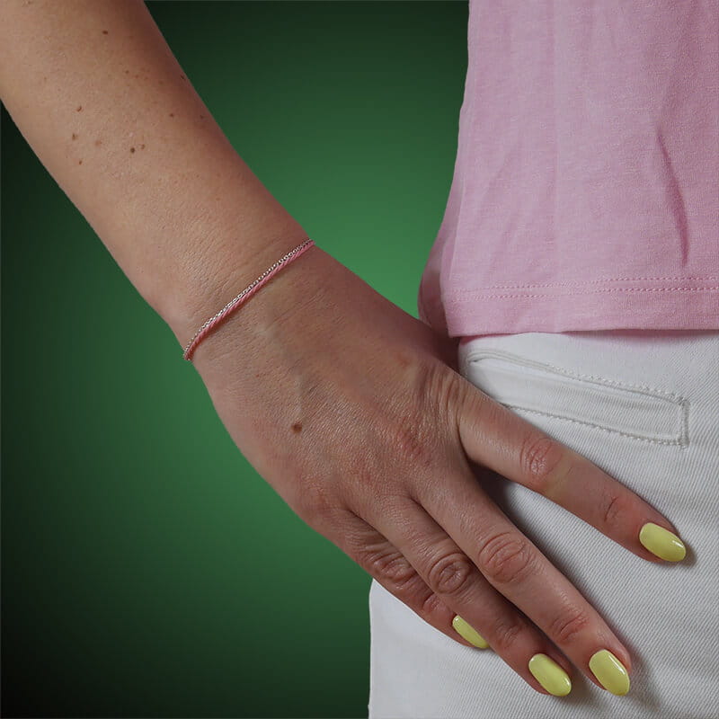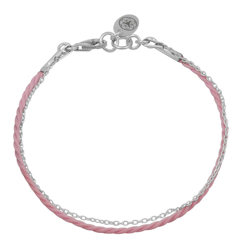 Bransoletka ze srebra sznurek pudrowy róż łańcuszek srebrny logo