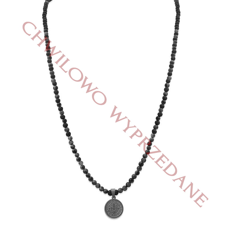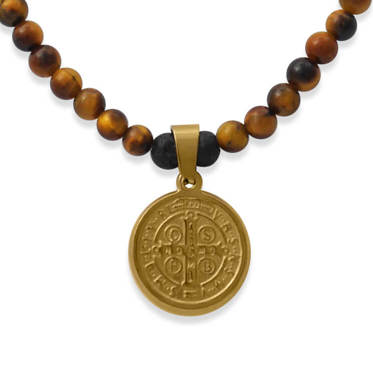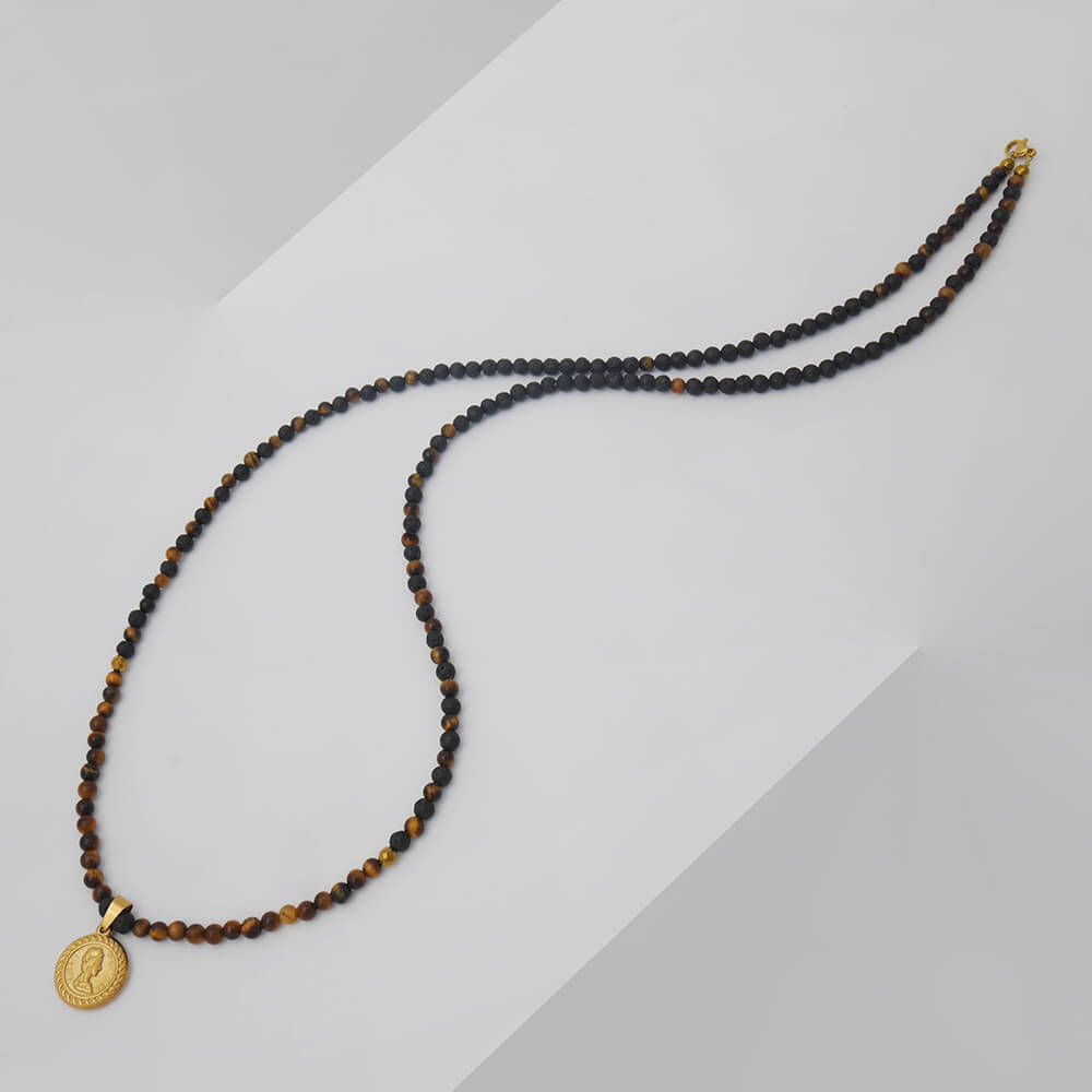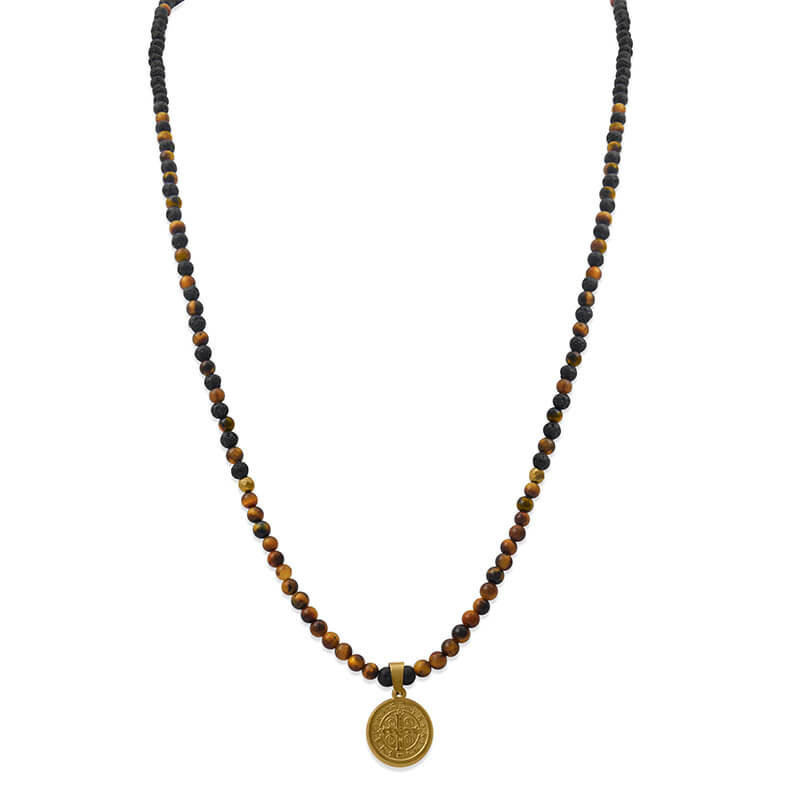 Naszyjnik z kamieni lawa tygrysie oko brązowe wisior stal medalion krzyż złoty