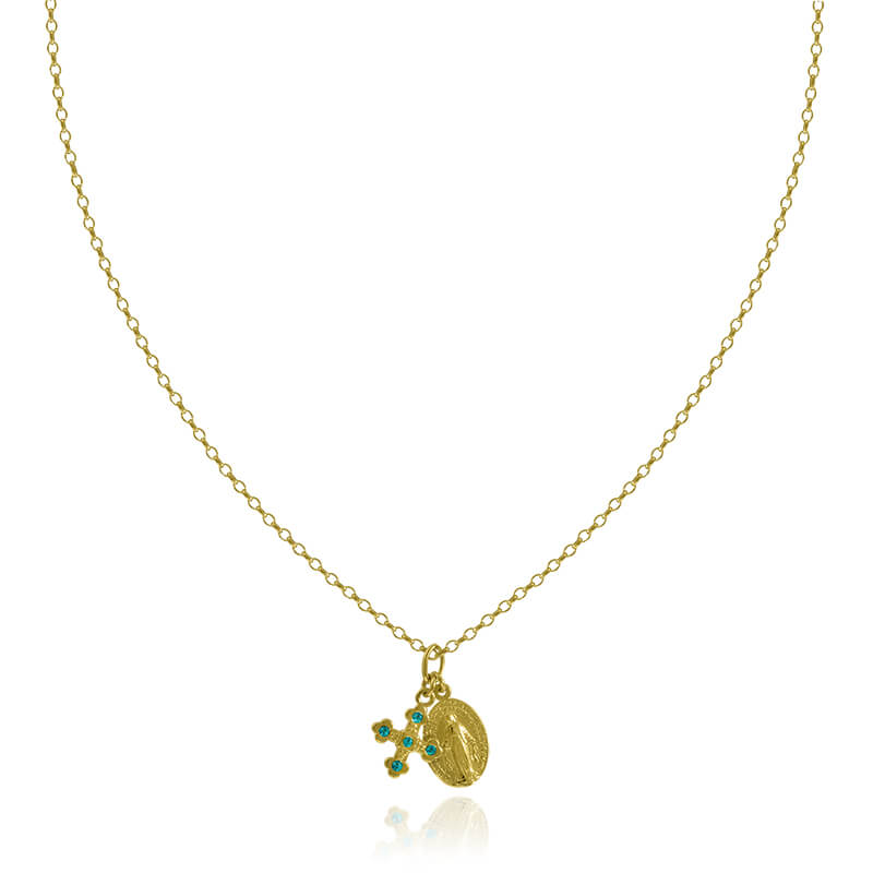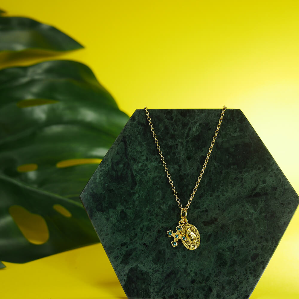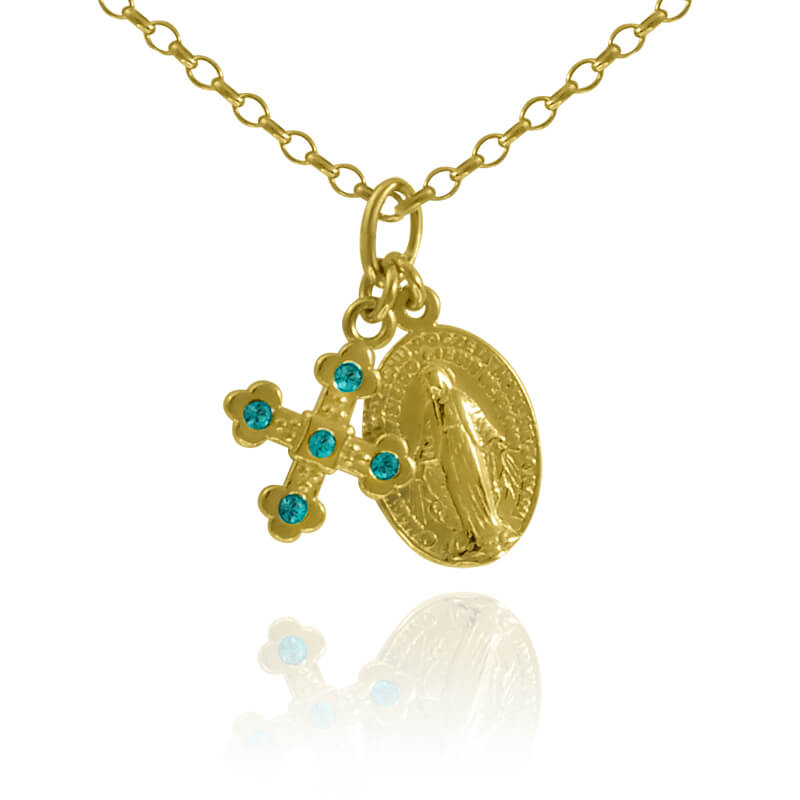 Naszyjnik jest wykonywany w całości ręcznie z pozłacanego srebra próby 925. Model ten posiada dwie zawieszki, jedną medalik Maryi Panny o wielkości 16 x 11 mm a drugą krzyż z cyrkoniami w szmaragdowym kolorze o wielkości 15 x 15 mm. Naszyjnik jest dostępny w długościach 41, 45 lub 50 cm i posiada zapięcie typu federing z zawieszką z logo firmy.