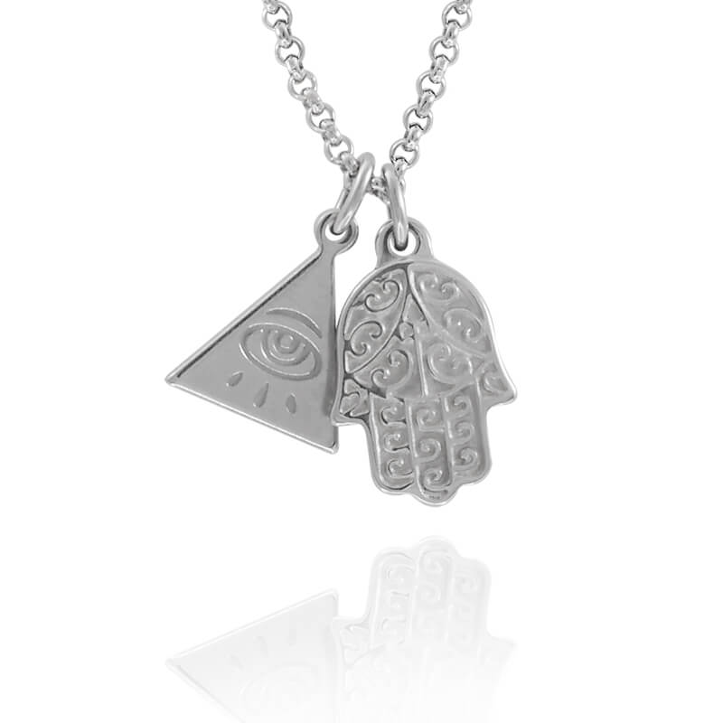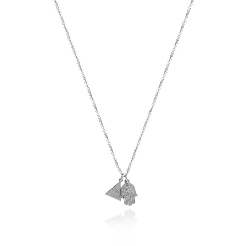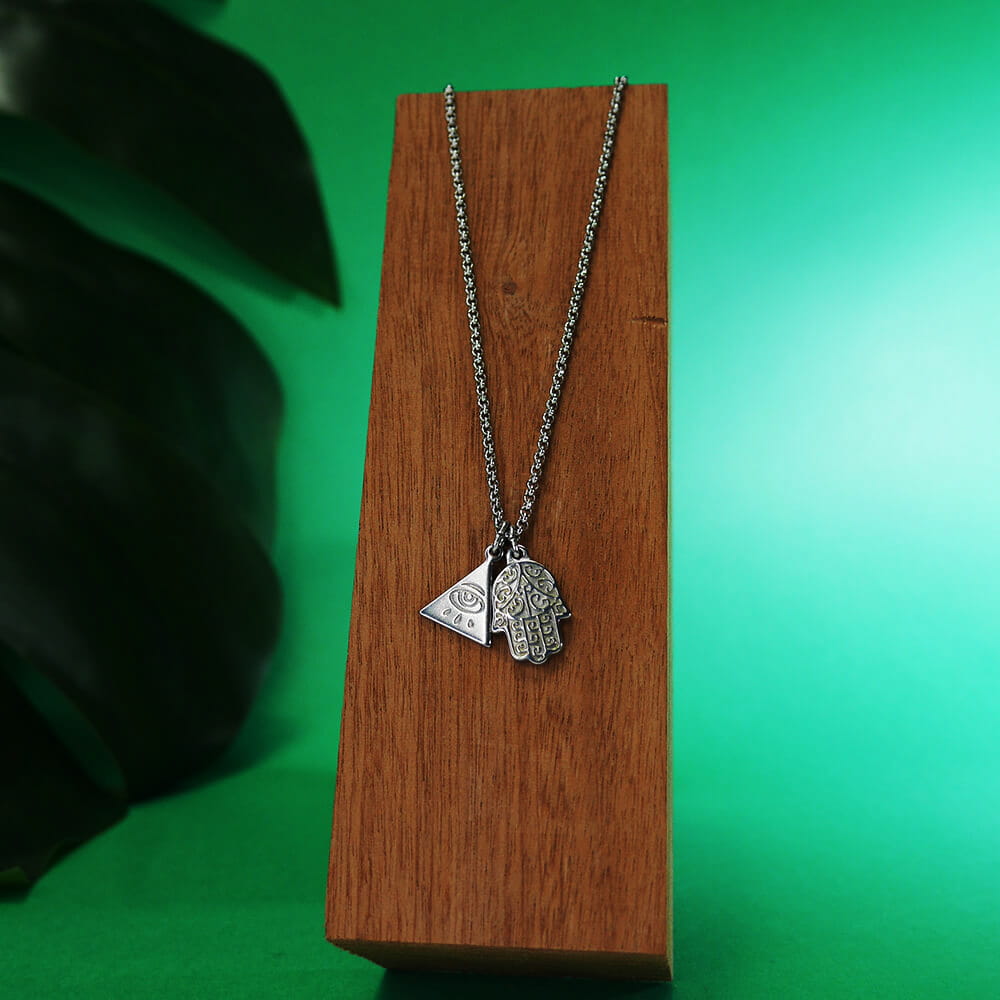 Naszyjnik jest wykonany w całości ze stali szlachetnej wysokiej jakości. Model ten posiada dwie zawieszki, jedną hamsa o wymiarach 18 x 12 mm i drugą oko proroka o wymiarach 14 x 13 mm. Naszyjnik jest wykonany z łańcucha typu rolo o grubości 2 mm i jest dostępny w długościach 45, 54, 61, 66 lub 71 cm. Naszyjnik jest zapinany na karabińczyk i posiada blaszkę z logo firmy. Model na zdjęciu prezentuje na sobie naszyjnik długości 66 cm.