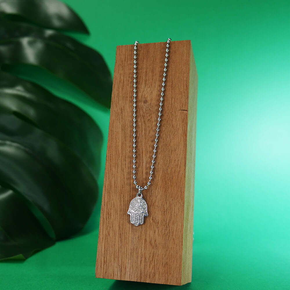Kulkowy naszyjnik jest wykonany w całości ze stali szlachetnej i posiada kulki o wielkości 2,5 mm. Naszyjnik posiada zawieszkę dłoni hamsa o wymiarach 18 x 12 mm i jest dostępny w długościach 41, 45, 50 lub 61 cm. Naszyjnik posiada zapięcie na karabińczyk z zawieszką z logo firmy.