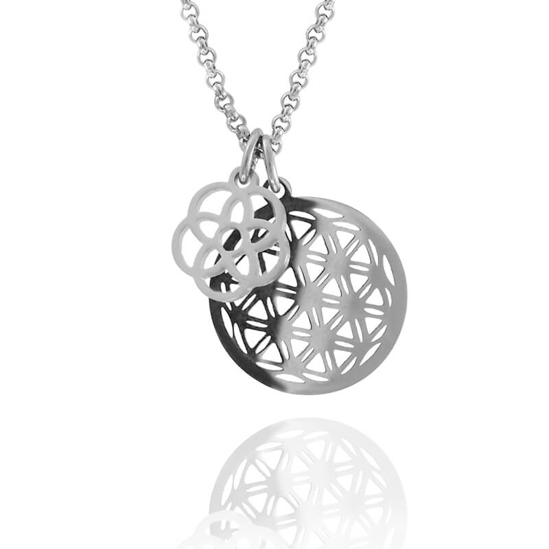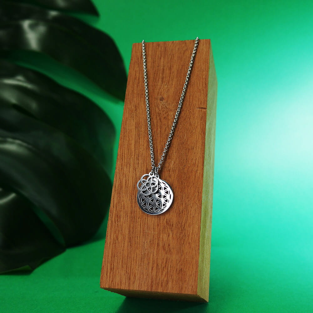 Naszyjnik jest wykonany w całości ze stali szlachetnej najwyższej jakości i posiada dwie zawieszki, jedną kwiatu życia o średnicy 2o mm i drugą owoc życia o średnicy 12 mm. Naszyjnik jest wykonany z łańcucha typu rolo o grubości 2 mm i jest dostępny w długościach 45, 54, 61, 66 lub 71 cm. Model ten jest zapinany na karabińczyk oraz posiada blaszkę z logo firmy.