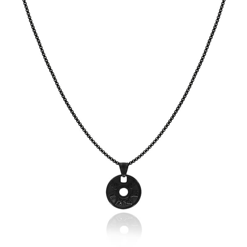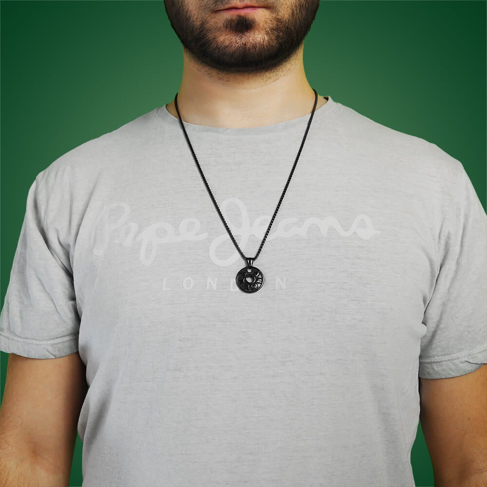 Męski czarny naszyjnik jest wykonany w całości ze stali szlachetnej w czarnym kolorze. Naszyjnik jest grubości 2,5 mm i posiada zawieszkę medalionu z mantrami o wielkości 24 mm. Model ten zapinany jest na stalowy karabińczyk i posiada blaszkę z grawerowanym logo firmy. Naszyjnik jest dostępny w długościach 45, 50, 61 lub 66 cm. Na zdjęciu model prezentuje na sobie naszyjnik długości 66 cm.