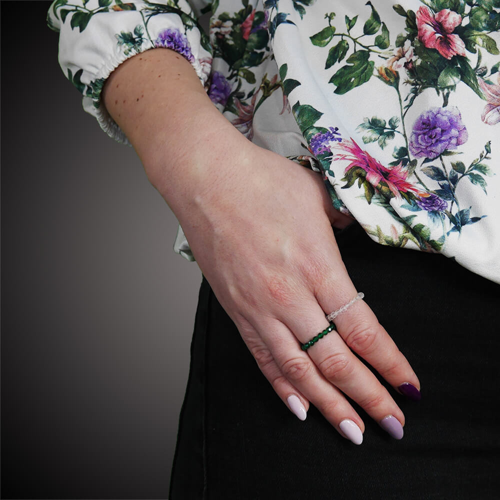 Bezbarwna, wytrzymała i elastyczna gumka pozwala w wygodny sposób zakładać bransoletki i pierścionki na niej wykonane. |